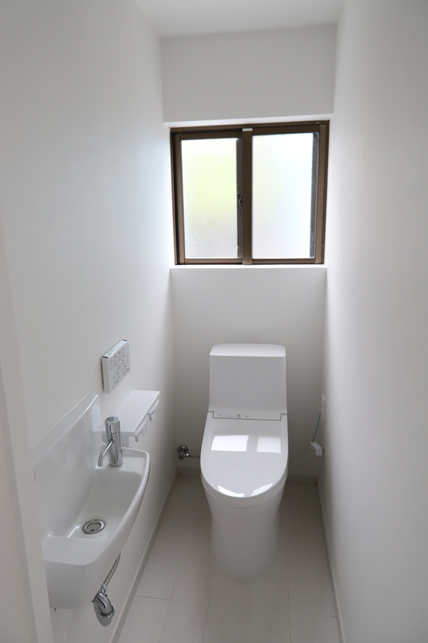 沖縄市|築40年|経年劣化を一新。掃除のしやすさと清潔感にこだわったトイレリフォーム before after Before 長年の使用による汚れの蓄積や、床のタイルの冷たさが気になっておられました。 また、古いタンク式のトイレは掃除がしにくく、お手入れに時間がかかるのがお悩みでした。 After お手入れのしやすさを最優先に、フチなし形状の便器をご提案しました。清潔感のあるホワイトを基調に仕上げています。